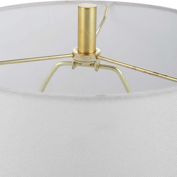 Stylish And Versatile, This Buffet Lamp Features A Slim Metal Body In An Elegant Brushed Gold Finish Paired With A Substantial White Marble Foot. The Round Hardback Shade Is Covered In A White Linen Fabric.