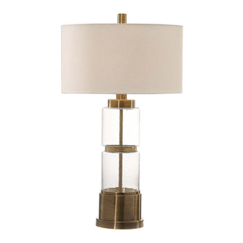 Uttermost's Lamps Combine Premium Quality Materials With Unique High-style Design.With The Advanced Product Engineering And Packaging Reinforcement, Uttermost Maintains Some Of The Lowest Damage Rates In The Industry. Each Product Is Designed, Manufactured And Packaged With Shipping In Mind. Stacked Clear Glass Columns With A Hammered Texture, Displayed With Antique Brass Plated Steel Details. The Round Hardback Drum Shade Is A White Linen Fabric With White Slubbing.