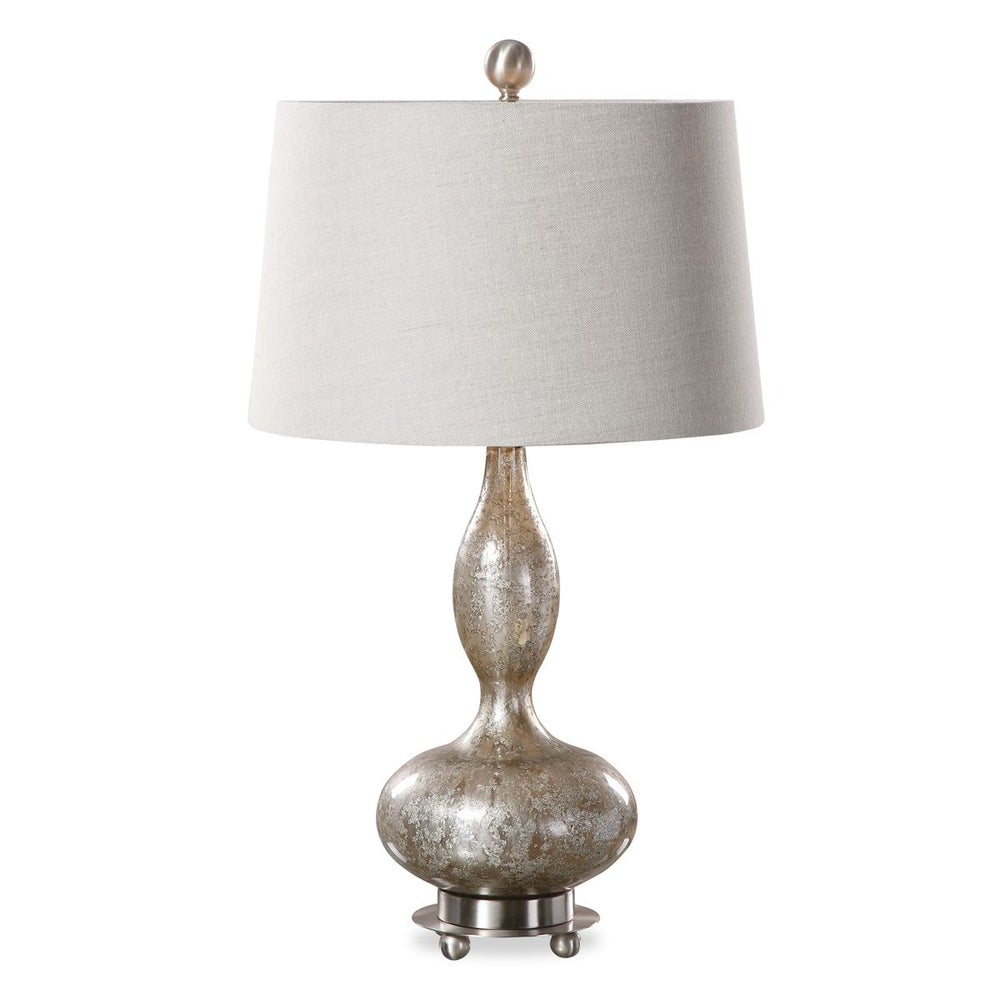 Smoked Mercury Glass Accented With Brushed Nickel Metal Details. The Tapered Round Hardback Shade Is A Light Beige Linen Fabric.