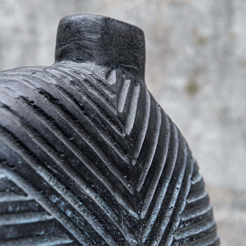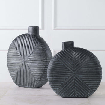 This Set Of Vases Is Accented By Contemporary Geometric Carving In Aged Black With Off-centered Openings, Perfect For Floral Stems Or Placed Among Your Other Favorite Accessories. Sizes: S-12x12x4, L-14x16x5