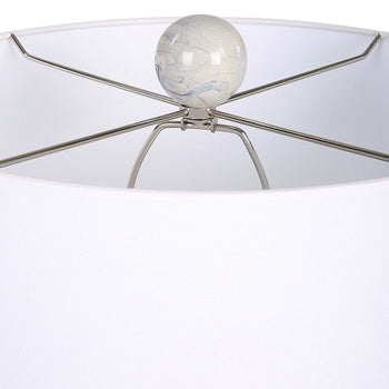 A Contemporary Take On Classic Blue And White Ceramics, This Ceramic Lamp Features A Unique Sculpted Design With A Hand Applied Light Cobalt Blue Drip Glaze And A Oversized Matching Ceramic Finial. The Table Lamp Is Paired With A Crisp White Hardback Drum Shade.