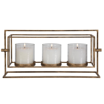Illuminate Your Space With A Warm Glow From This Textured Glass And Iron Triple Candle Lantern. Designed To Hold Three Pillar Candles, It Features Removable Textured Clear Glass Hurricanes And Iron Stand With Antique Gold Finish. Three, White 3"x 3" Candles Is Included.