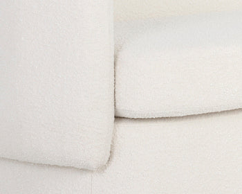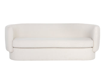 Evoke a stylish flair with this curved, contemporary sofa. Features a capsule shaped frame in maya white fabric. Maya fabric features a boucle texture. Eye-catching from all angles. Coordinating armchair also available.