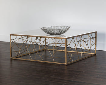 This large and dramatic coffee table is sure to be the center of attention in any room. A white Volakas marble top is beautifully paired with a powdere-coated rustic bronze steel frame in an intriguing webbed pattern. Suitable for lounge and living spaces in residential and commercial environments. As marble is a natural material, unique veining, pitting, fissures, micro-cracks and colour variations are all characteristics that add to the uniqueness and beauty of each piece.
