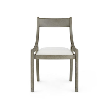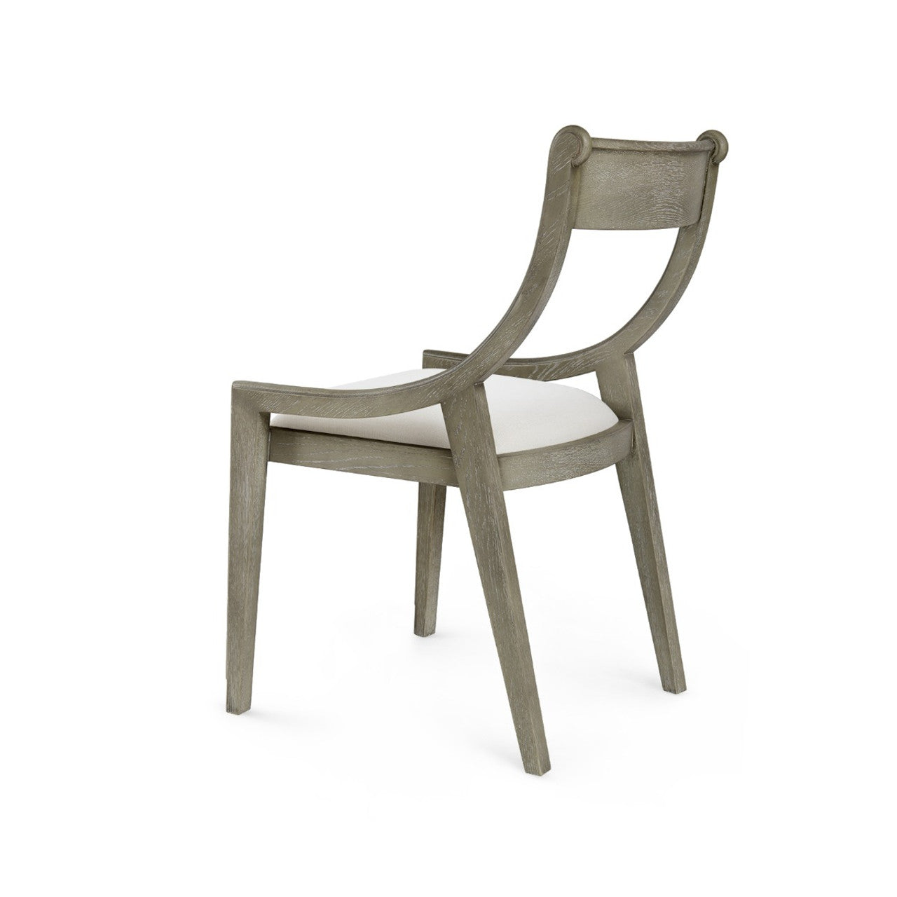 Based on a Greek design, the Alexa Chair from Villa & House has hand-carved scrolling, a rounded top edge, and a unique swooped silhouette. Produced in hand-limed oak—a process which Villa & House taught the craftsmen over their years of collaboration—the Alexa Chair is pared back with little ornamentation. The chair has hand-carved details—like the elegant scrolls that top the chair’s backrest—and a refined design. The front of the chair’s legs top edge is rounded by hand to elevate the overall silhouette. The natural linen drop-in cushion can be easily removed for professional re-upholstery. This Alexa Chair is multi-functional and extremely comfortable. Its minimal style lends to both modern and traditional decors. The piece could be used as an office chair, a dining chair, a vanity seat or in an entryway. 21.25W x 22.5D x 33.5H
