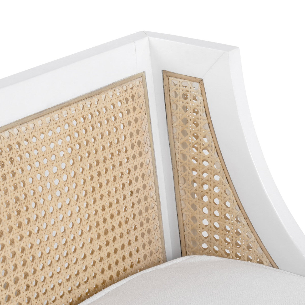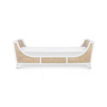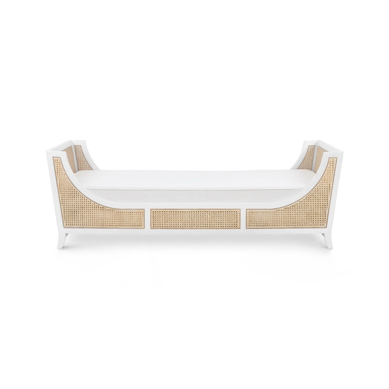 A contemporary interpretation of English Regency design, the Alyssa Daybed will have your guests swooning. This elegant piece is composed of Vanilla Pigmented Lacquered Wood with Bleached Cane woven in a traditional octagonal pattern. The piece comes with a large cushion, the size of a twin mattress, with a natural linen cover. Perfect for a salon living room, or a room that turns into a bedroom in a pinch. This gorgeous daybed will add an effortless and regal element to your space. 84W x 41.5D x 28.5H