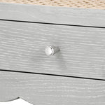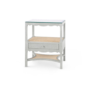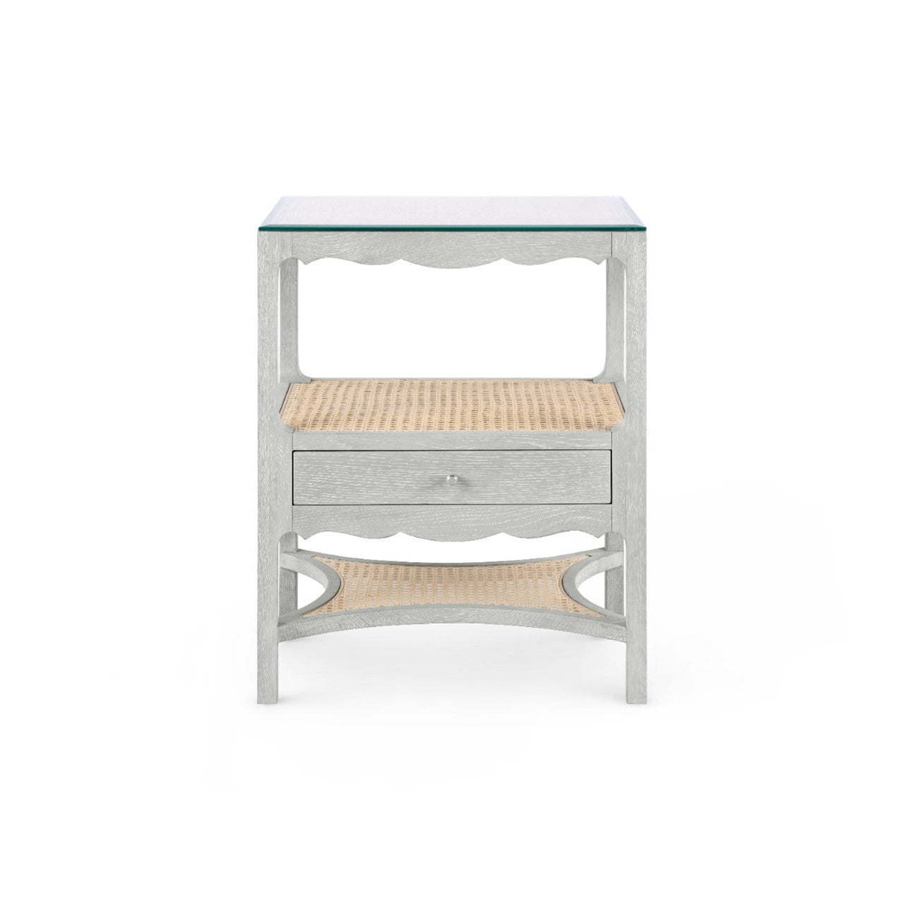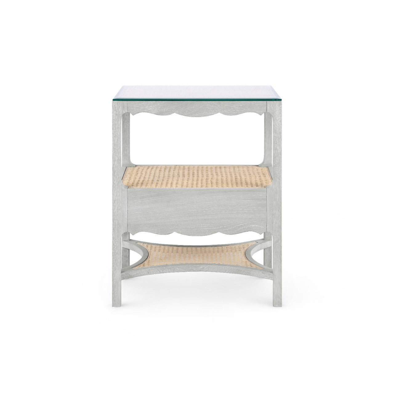 The Arianna Side Table is a soft romantic piece that is sure to be a Villa & House classic. Made of cerused oak with two shelves of bleached octagonal cane, it is adorned with gorgeous hand-carved detailing, delicate like the flourish of a quill. The top surface is protected by a layer of clear inset tempered glass. The Arianna also features one drawer with a small brass pull. This is a gorgeous table that would work in a traditional home, cottage or any space that needs a soft organic touch. 22.25W x 18.25D x 29H