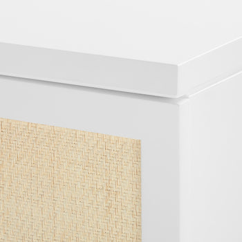 Modern minimalism meets Eastern romance in our Astor Collection, inspired by the elegance of Chinoiserie design. The Astor 3-Drawer and 2-Door Cabinet, available in a rich black or white lacquer, features panels of finely-woven grasscloth which add a natural element to a bedroom, living room or study with worldly ambitions. Two doors and three drawers finished with custom brushed brass pulls open up to reveal a veneered interior with adjustable shelves and plenty of space to store anything from linens to dinnerware. Undeniably a chic and sumptuous piece of work whose unique versatility makes it an appropriate addition in a dining room, living room, or bedroom. 72W x 18D x 30.5H