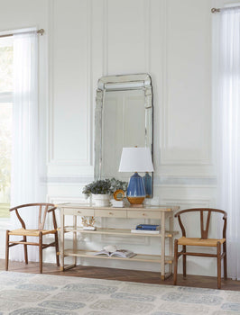The Austin collection is influenced by traditional Japanese furniture design which emphasizes simplicity, natural materials, and understated natural finishes. The silhouette is reminiscent of traditional Japanese architecture with strong horizontal elements, while the hand-woven cane shelving, bronze-accented corners, and hand-carved grooving, which surrounds the top, speak of fine workmanship. Integrated concealed drawers maintain the integrity of the design and the glass shelving sits atop the woven cane protecting it and imparting airiness to the piece. 56W x 16D x 31.5H