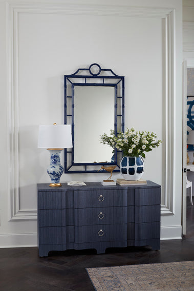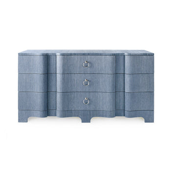 Sweeping serpentine curves give the classic pieces of the Bardot Collection a truly unique touch of surrealism. A tasteful play on form, the facade of our Bardot Extra Large 9-Drawer evokes a sense of fluid movement, with drawers expertly crafted to resemble rippling waves. Its Art Deco-inspired glamour is furthered by its polished nickel pulls, while the full sense of its quality can quite literally be felt in the outer layer of lacquered grasscloth. From its natural texture to its soft coloring, this lovely furnishing is made to withstand the test of time in both craftsmanship and aesthetic. For while it certainly stands out, you'll find that it feels right at home in any style of decor. 59W x 20D x 32H