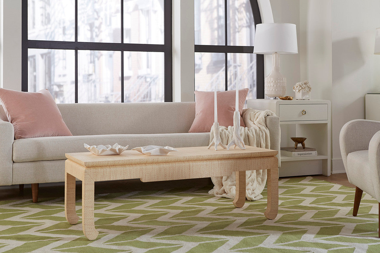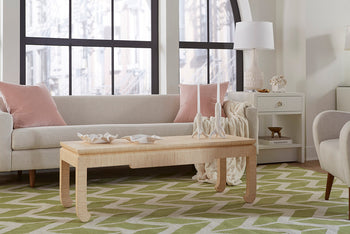 With new proportions and thicker chow feet legs, the Bethany Rectangular Coffee Table from Villa & House is a substantial piece. Finished in a textural, lacquered grasscloth, the Bethany has a chunky appearance that almost reads like plaster. More traditional than its square counterpart, The Bethany Rectangular Coffee Table is 54 by 30 inches and is the most sizable coffee table in Villa & House's assortment. The Bethany is equally welcomed as a neutral moment in a beachy, coastal room like a Long Beach dining room or as a gathering place in a brightly colored sunroom.