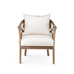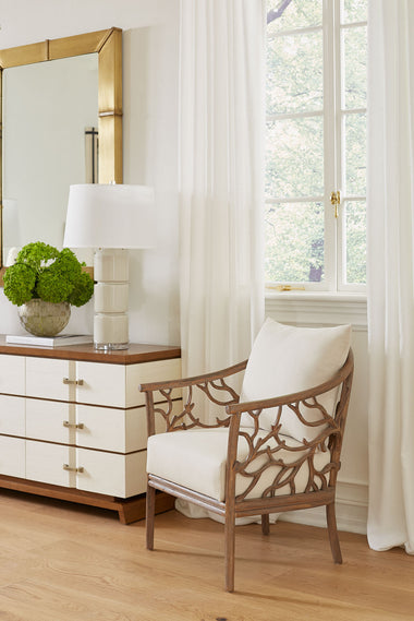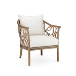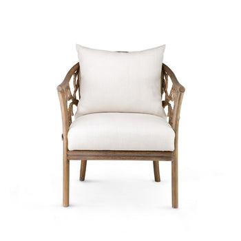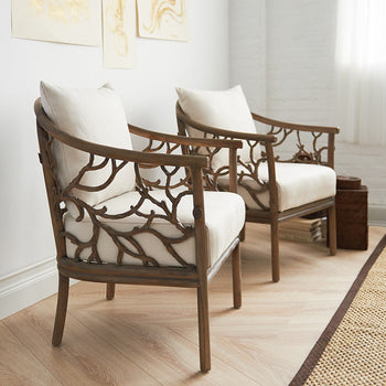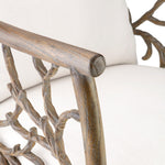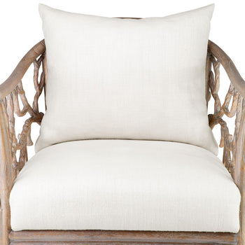 Whether you're outfitting a cozy country cottage, beachside villa, or eclectic urban loft, add a touch of woodland whimsy to your space with our Bosco collection. An updated expression of classic French faux bois design, in which natural tree-like features of bark and branches are brought to hyperrealistic realization, our Bosco Armchair features a hand-carved silhouette of solid Cape Lilac Mahogany, intricately crafted to resemble a magical swirl of twigs. The gorgeously rustic elements are refined by a light driftwood finish, along with plush linen drop-in cushions for a luxe, comfortable seat. 26.5W x 27D x 32.5H