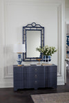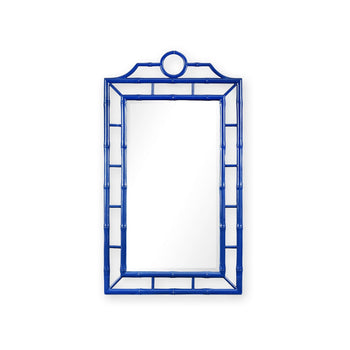 Throughout the Chloe Collection, our craftsmen have taken the ornate elements of Chinoiserie design, made famous by the likes of Thomas Chippendale in the 18th century, and pared them down to showcase their elegant essence through refined simplicity. Solid mahogany has been expertly carved to resemble bamboo, which here makes up the fretwork frame of the Chloe Mirror, forming a decorative, Asian-inspired design. The faux bamboo border, lacquered and finished in rich navy blue, provides a lightness fit for a sunny beach home (or a bedroom, living room or study you wish would feel like one). Pair with our Chloe chairs to create a luxurious Pacific paradise motif, or allow it to stand alone as an eye-catching accent. 31.5W x 1.75D x 56H