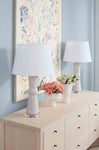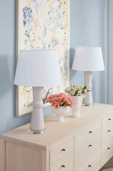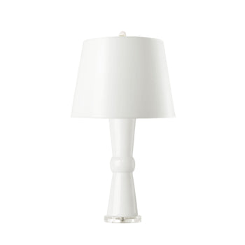 The elegant silhouette of the Clarissa Lamp pays homage to the traditional Chinese "Gu" a vessel marked by its flared top and base, coming to a slender meeting in the middle. While its elongated shape and exquisite sheen express a sense of delicacy, the Clarissa is rendered in durable American ceramic, crafted by our experienced artisans. Its chic white finish has been given a medium-reflective glaze while its clear acrylic base adds an extra touch of shine. Pair it with a slightly tapered drum shade to create a classic look in a sitting room, bedroom, or study. Please note: Villa & House's lamp shades are sold separately. 6W x 6D x 29H