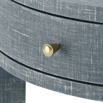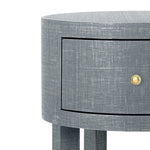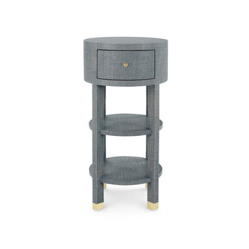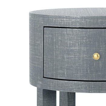 An ideal example of Villa & House's signature use of unique finishes and contemporary silhouettes, the Claudette 1-Drawer Round Side Table is instantly eye-catching. At once both sophisticated and fresh, its washed lacquered linen has been meticulously draped over the structured, modern form providing a touch of texture to its sleek stacked shelving and rounded lines. Its soft gray color finds modern accents in a custom cast brass or nickel pull and set of sabots on its legs. Next to a sofa or bed, the piece provides useful yet compact storage with its inset drawer and open shelves, fit for displaying small, decorative objects, candles, or miniature plants. 13.75W x 13.75D x 28.25H