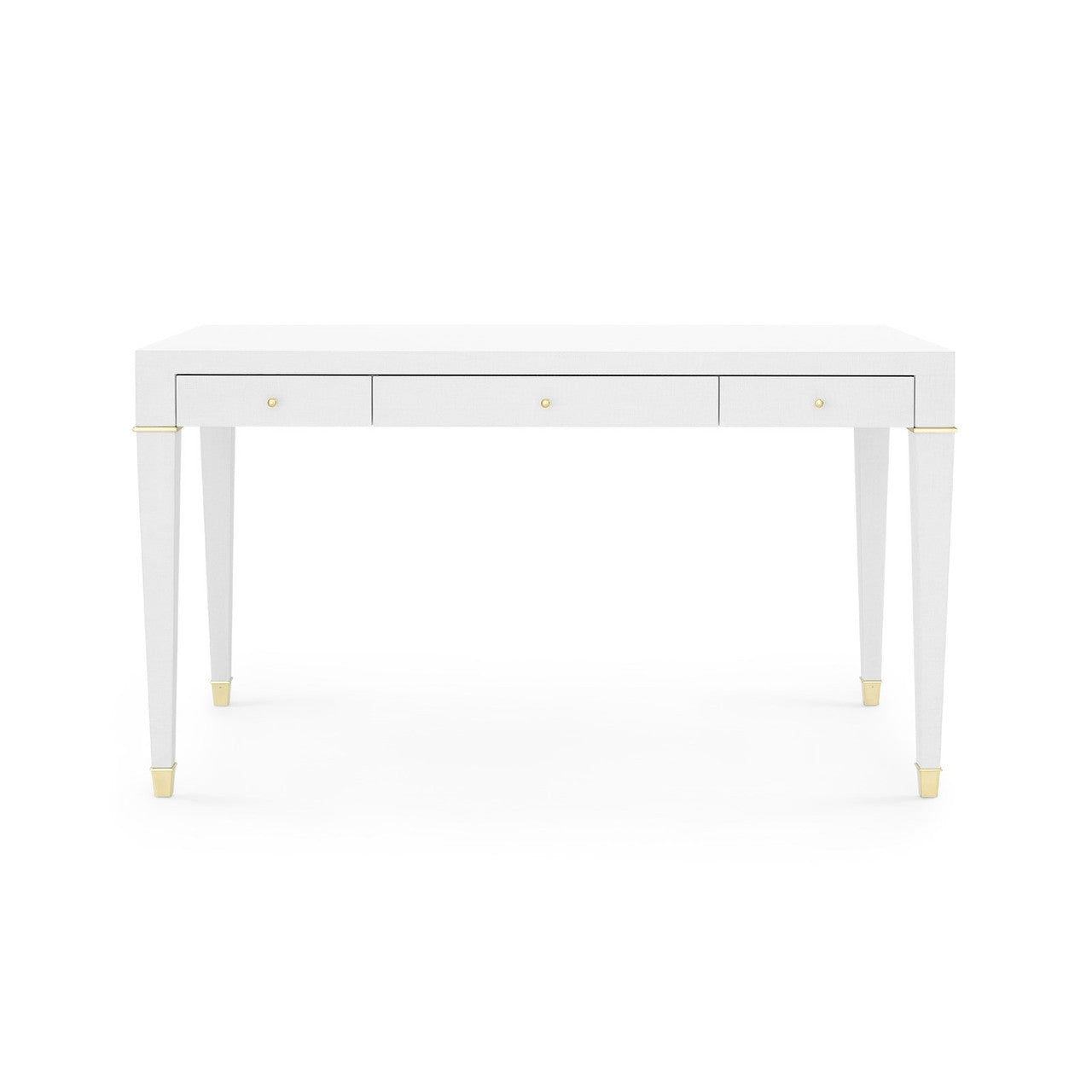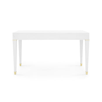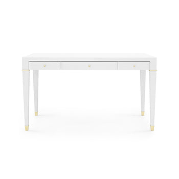 An ideal example of Villa & House's signature use of unique finishes, the Claudette Collection is instantly eye-catching thanks to the look of its washed lacquered linen. At once both sophisticated and fresh, the material has been meticulously draped over the structured, modern form of the Claudette Desk, providing a touch of texture to its sleek, clean lines. Its soft white color finds modern accents in the custom cast brass or nickel pulls and set of sabots on its legs. Svelte proportions add to its upscale feel in a sitting room, study, or bedroom, with three floating drawers of alternating length providing hide-away storage for documents, office supplies, and more. 54W x 26D x 30.25H