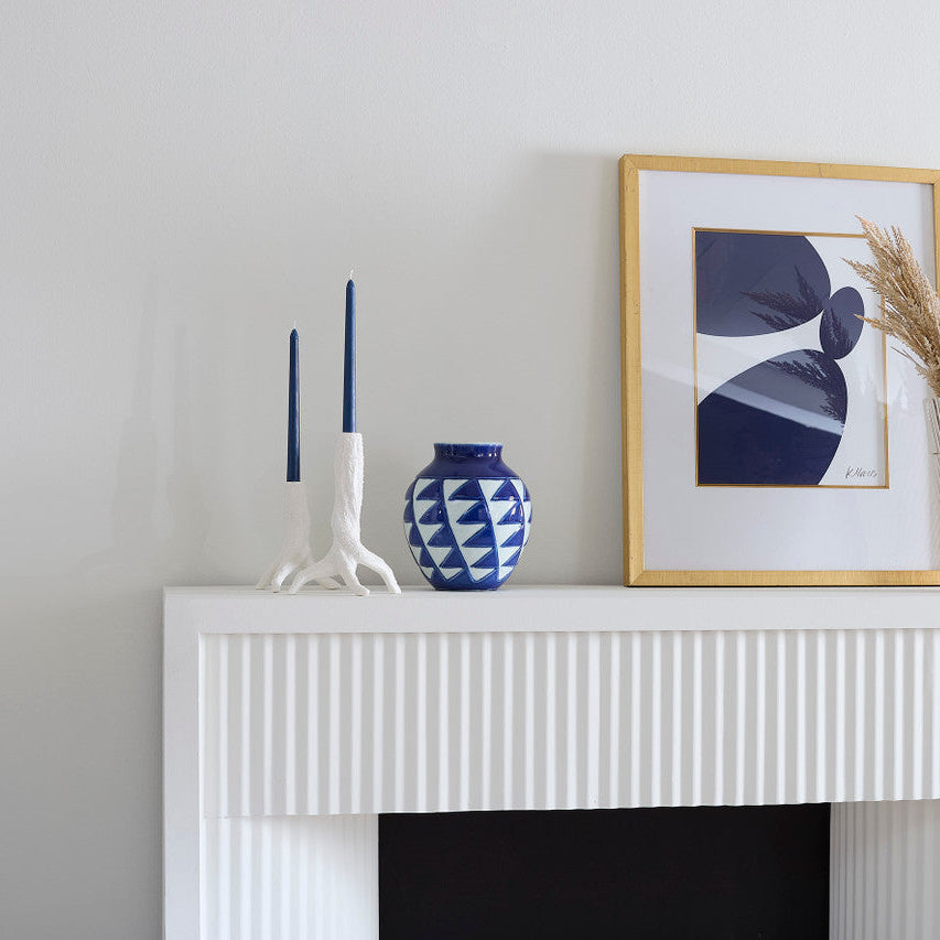 The Columbina Vase captures the essence of Mid-Century Modern design with its bold geometric patterns and vibrant cobalt blue and white contrast. Its classic bouquet shape combines simplicity with a touch of artistic flair, featuring interlocking triangular shapes that reflect the era’s abstract style. Perfect for making a statement, this vase brings a dynamic and modern touch to any space, blending art and functionality effortlessly. 8W x 8D x 9.5H