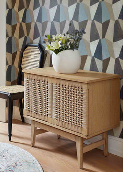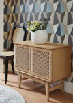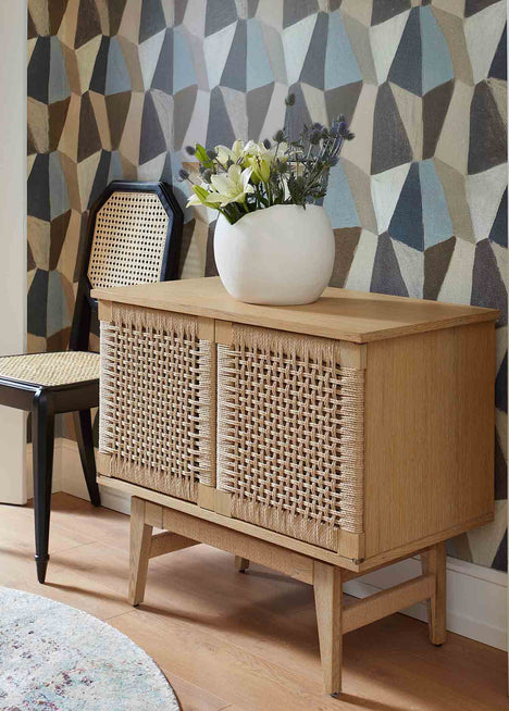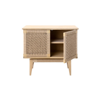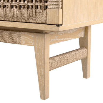 The Dante Collection is an exciting and unique addition to our offerings at Villa & House. The design combines a retro cool with an organic touch reminiscent of midcentury Malibu. Rattan rope is hand-wrapped and hand-woven onto the Cerused Oak panels and base providing a natural pattern and texture. This piece comes with two touch-latch doors and one interior adjustable shelf. You can use it as a side table, a nightstand, or even make it a conversation piece by turning it into a small bar cabinet. This is a piece you will love for years to come. 31.5W x 18.25D x 28.25H