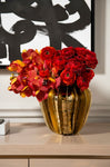 There's an almost otherworldly sense of cool in our Doral Vase, which seems to have landed from some faraway civilization. Futuristic yet organic in its form, the piece is encompassed by bold fins of hand-cut and hand-hammered metal with edges that show the hands of our expert craftsman. Its super-shiny mirrored brass finish glints with glamour and brings a unique brilliance to a dining table, side table, or console, Fill with fresh flowers or allow it to shine on its own. 10W x 10D x 8.5H