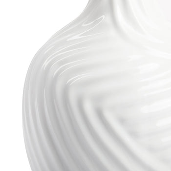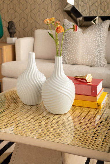 Become entranced in the Dune vase’s intricate parallel design. Its minimalist lines create shadows that draw intrigue, and its glazed porcelain finish make it an elegant centerpiece for your dining table or a vessel for your prettiest bouquet. 8W x 8D x 13H