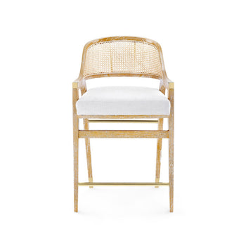 With the Edward Collection, our craftsmen have taken a classic shape and energized it using fresh mixed materials. The result is a complementary selection of seats which all make a sophisticated impression with an air of casual cool. Here, the Edward Counter Stool cuts a fine figure in Cape Lilac Mahogany, with a natural finish that underscores the grain of the elongated wooden frame. Its back boasts a screen of lacquered hand-tied caning, with a form-fitting curve to ensure ultimate comfort. Metallic accents speak to our artisans’ eye for detail, with hand-cast brass stretchers, sabots, and armcaps providing a luxurious finish touch. The Edward is an ideal choice for a kitchen island dining set, and would fit well in anything from an urban loft kitchen to a modern scheme. 21.25W x 22D x 36H