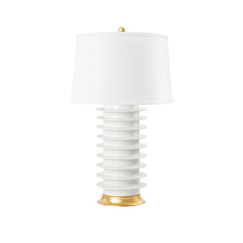 The Elektra Lamp Collection is a knockout. This modern industrial silhouette meets traditional style in richly saturated glazed porcelain finished with a hand gold-leafed base and ball finial. Geometric in all the right ways, the Elektra Lamp makes a bold statement in any living room. 7W x 7D x 27H