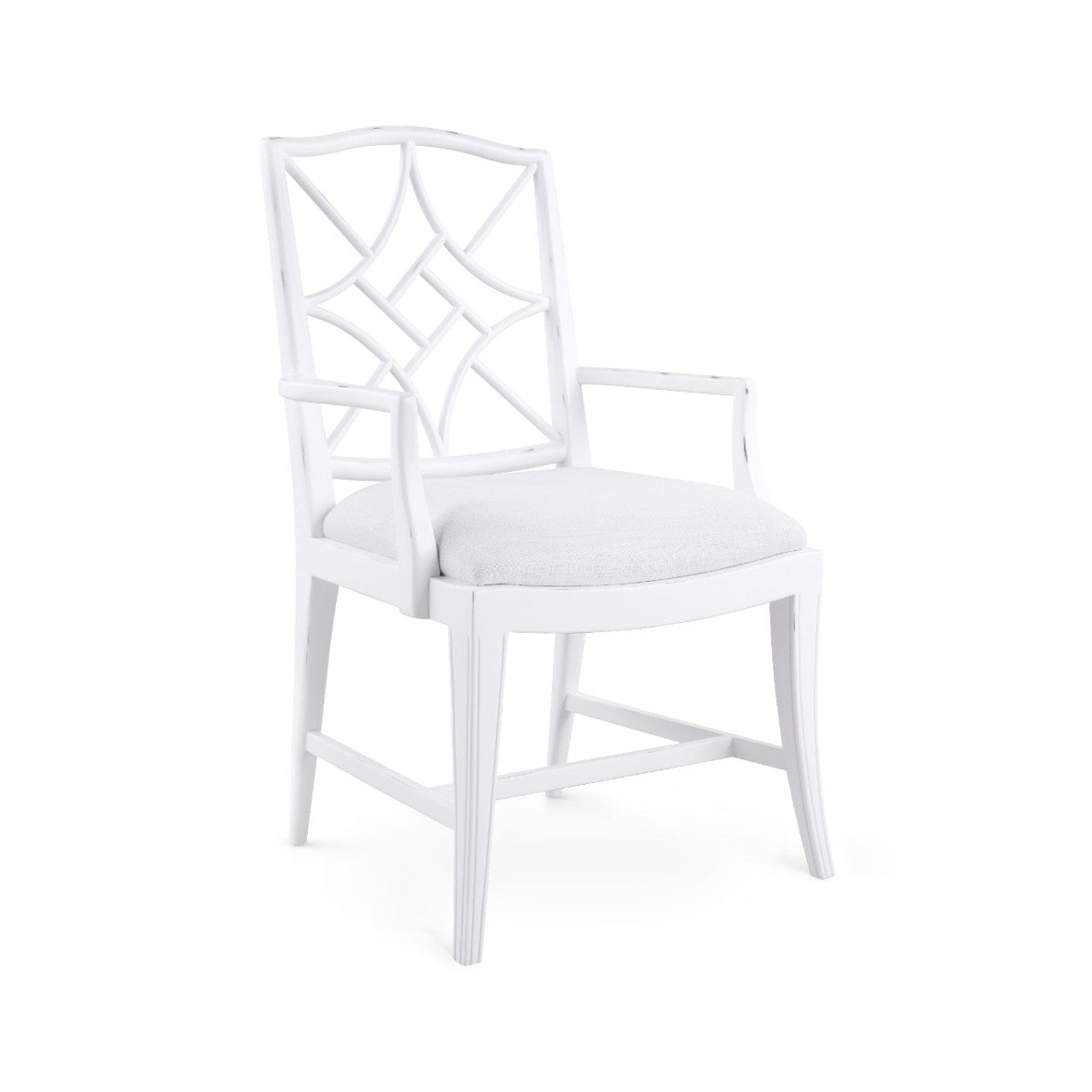 The Evelyn Collection brings Eastern-inspired elegance to life. Our simplified interpretation of Thomas Chippendale's famous chinoiserie design gives our chairs a more relaxed, contemporary feel with a dash of country charm. Created from mahogany with an antiqued lacquered white finish, the frame of the Evelyn Armchair boasts an intricate fretwork back nodding to its Asian inspiration, with a softly rounded top. Gently curved details appear throughout, from the slight dip in the seat and armrests to the fluted, tapering legs. A linen drop-in cushion completes the piece, making it a comfortable yet stylish pick for a kitchen or dining room set. 23.25W x 23.5D x 38.5H