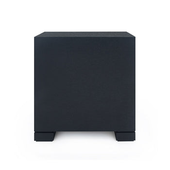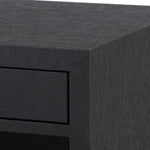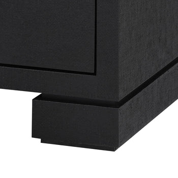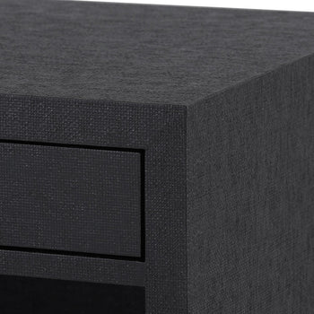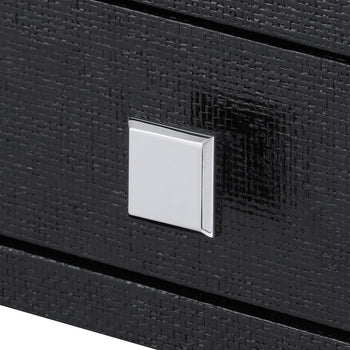 The Frances Collection includes perfectly tailored pieces which make the most of the luxurious finishes Villa & House is known for. Expertly swathed in lacquered grasscloth, the Frances 2-Drawer Side Table provides a unique contrast between its tactile materials and structured form. Clean lines make their way from its base to its surface, with a thinner drawer floating beneath its top and a thicker one below. Each boasting rich stained wood interiors and chrome finished accents, the drawers are separated by an inset space, doubling its surface area for storage and display. In sophisticated black, the Frances makes a sleek addition in a modern study, bedroom, or living room. 26.25W x 18.25D x 29.5H