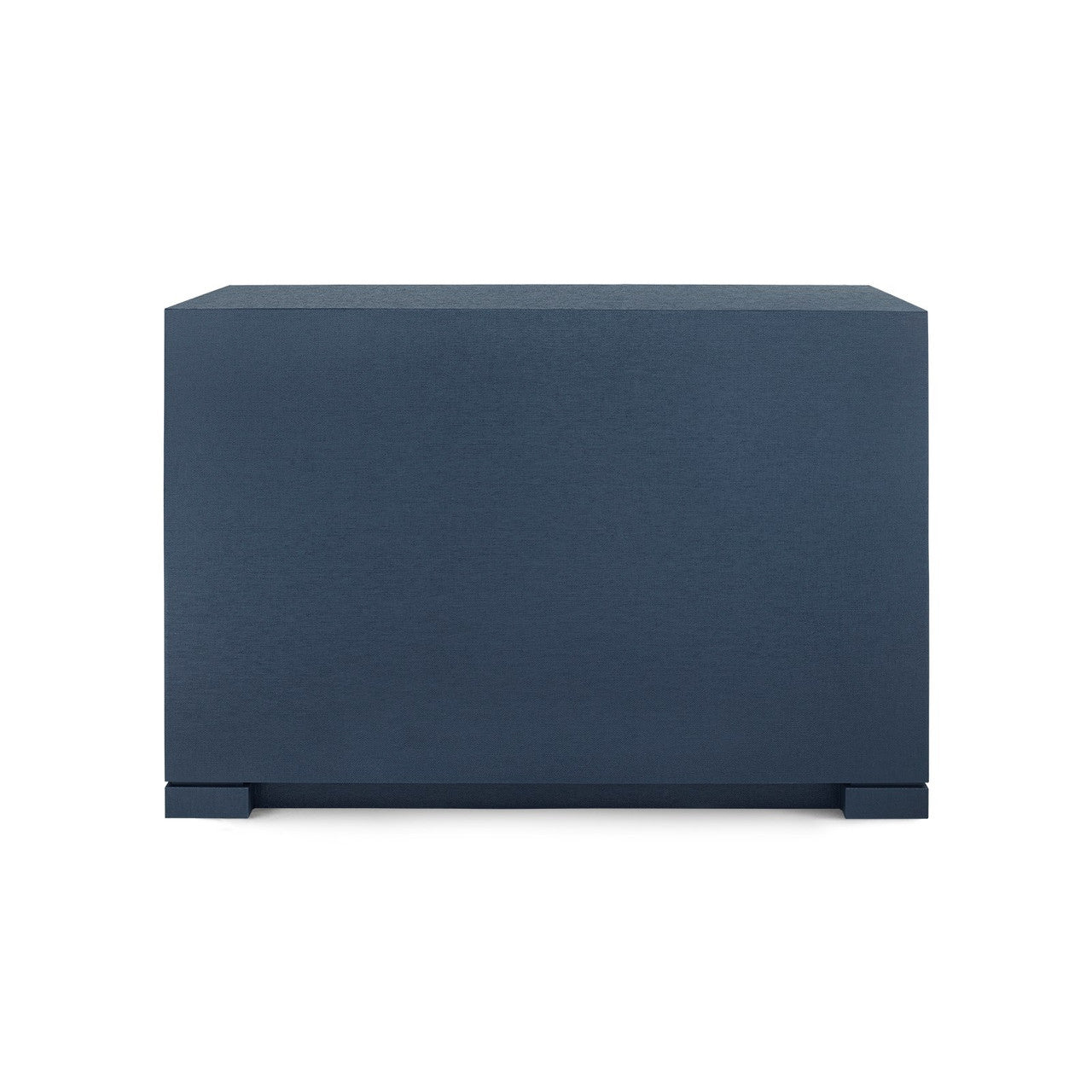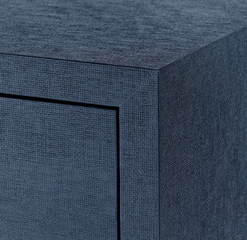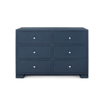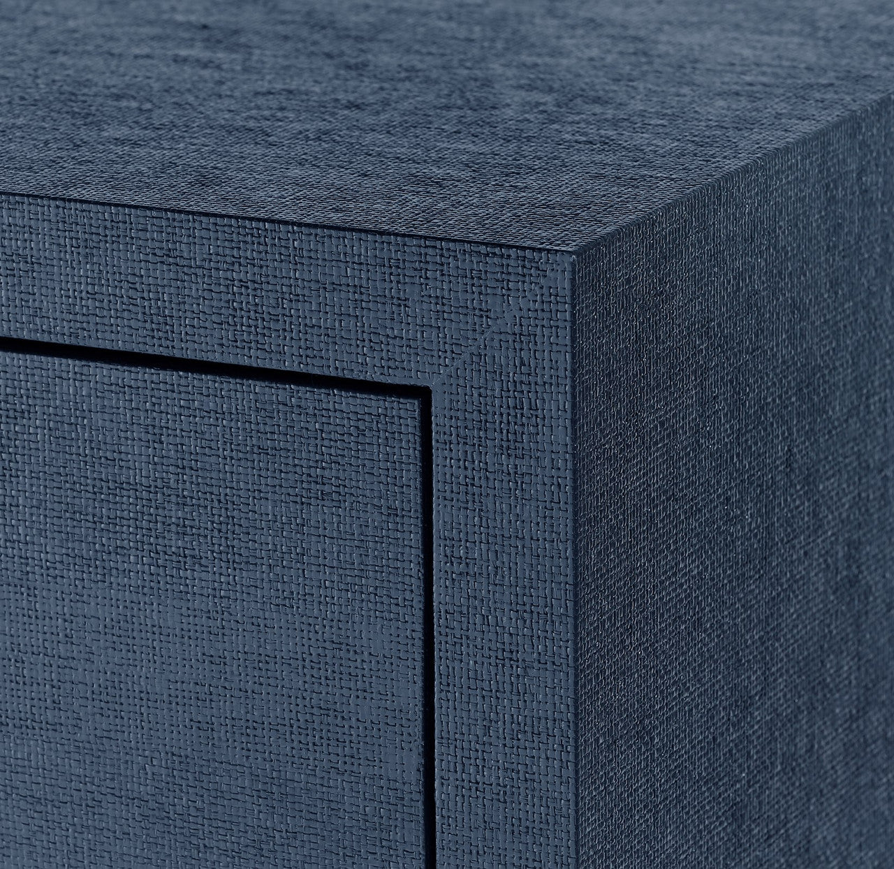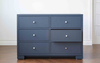 The Frances Collection presents perfectly tailored pieces which make the most of the luxurious finishes Villa & House is known for. Expertly swathed in lacquered grasscloth, the Frances Extra Large 6-Drawer provides a unique contrast between its tactile materials and structured form. Clean lines mark its symmetrical façade, with two rows of three drawers stacked in proportion. Each set on soft-closing glides, the spacious drawers boast rich stained wood interiors and chrome finished square pulls. In sophisticated navy blue, the Frances makes for a sleek storage solution in any space. 54W x 21D x 37H