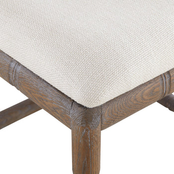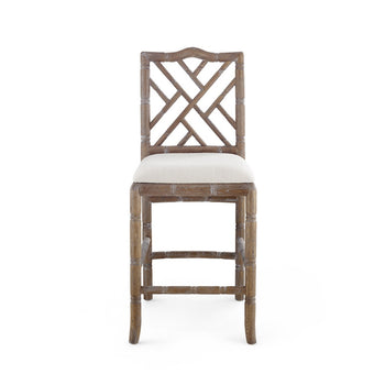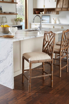 Our Hampton Collection interprets lavish Chinoiserie design through the lens of beachy relaxation. The result? Fabulous furnishings which take you away to a pacific paradise. The limed oak frame of the Hampton Counter Stool is carved to resemble bamboo, underscoring the piece’s inherently organic impression. Subtle nods to its Asian inspiration could be found in the elegant fretwork of its back and the slight curves of its front legs. A simple linen drop-in cushion completes its laid-back appeal. A lovely set for a kitchen in a breezy beach home or modern country cottage. Our counter stools are the perfect height and proportions for a kitchen island or bar. 17W x 17.5D x 40.5H