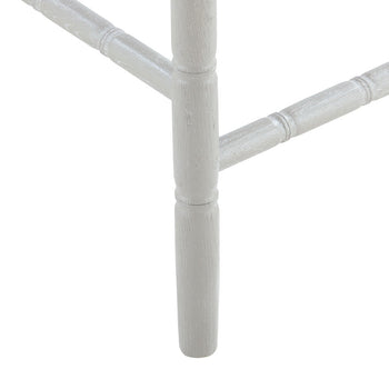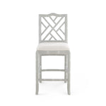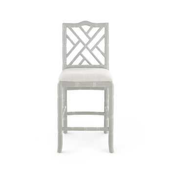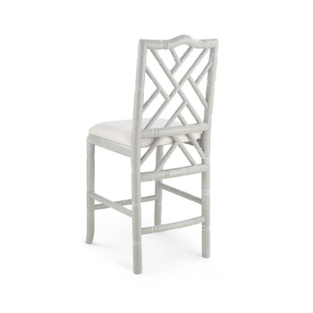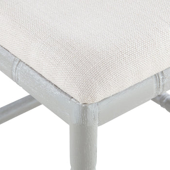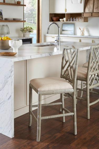 Our Hampton Collection interprets lavish Chinoiserie design through the lens of beachy relaxation. The result? Fabulous furnishings which take you away to a pacific paradise. The limed oak frame of the Hampton Counter Stool is carved to resemble bamboo, underscoring the piece’s inherently organic impression. Subtle nods to its Asian inspiration could be found in the elegant fretwork of its back and the slight curves of its front legs. A simple linen drop-in cushion completes its laid-back appeal. A lovely set for a kitchen in a breezy beach home or modern country cottage. Our counter stools are the perfect height and proportions for a kitchen island or bar. 17W x 17.5D x 40.5H