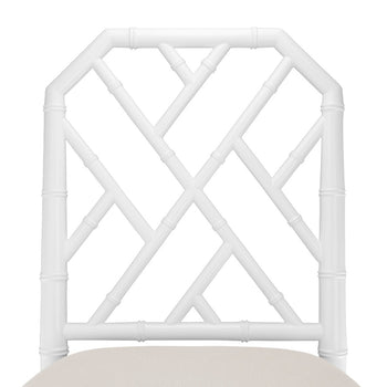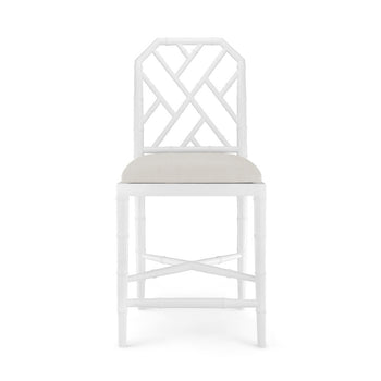 The Jardin Collection revisits one of Villa & House's beloved design motifs, inspired by classic Chinoiseries. A rich lacquered finish adds to the sophistication of the design, which sees solid mahogany artisanally hand-carved to resemble bamboo. Decorative lattice fretwork, diagonal stretchers, and gently tapered legs add visual and structural interest while maintaining an air of elegant simplicity. Completed with a linen drop in cushion, the Jardin Counter Stool feels at once relaxed and undeniably upscale. Either at a kitchen island or home bar, this stool invites you to sit back in style. 19W x 18D x 41.75H