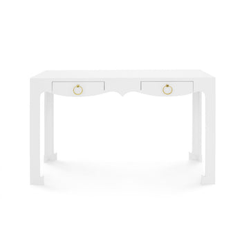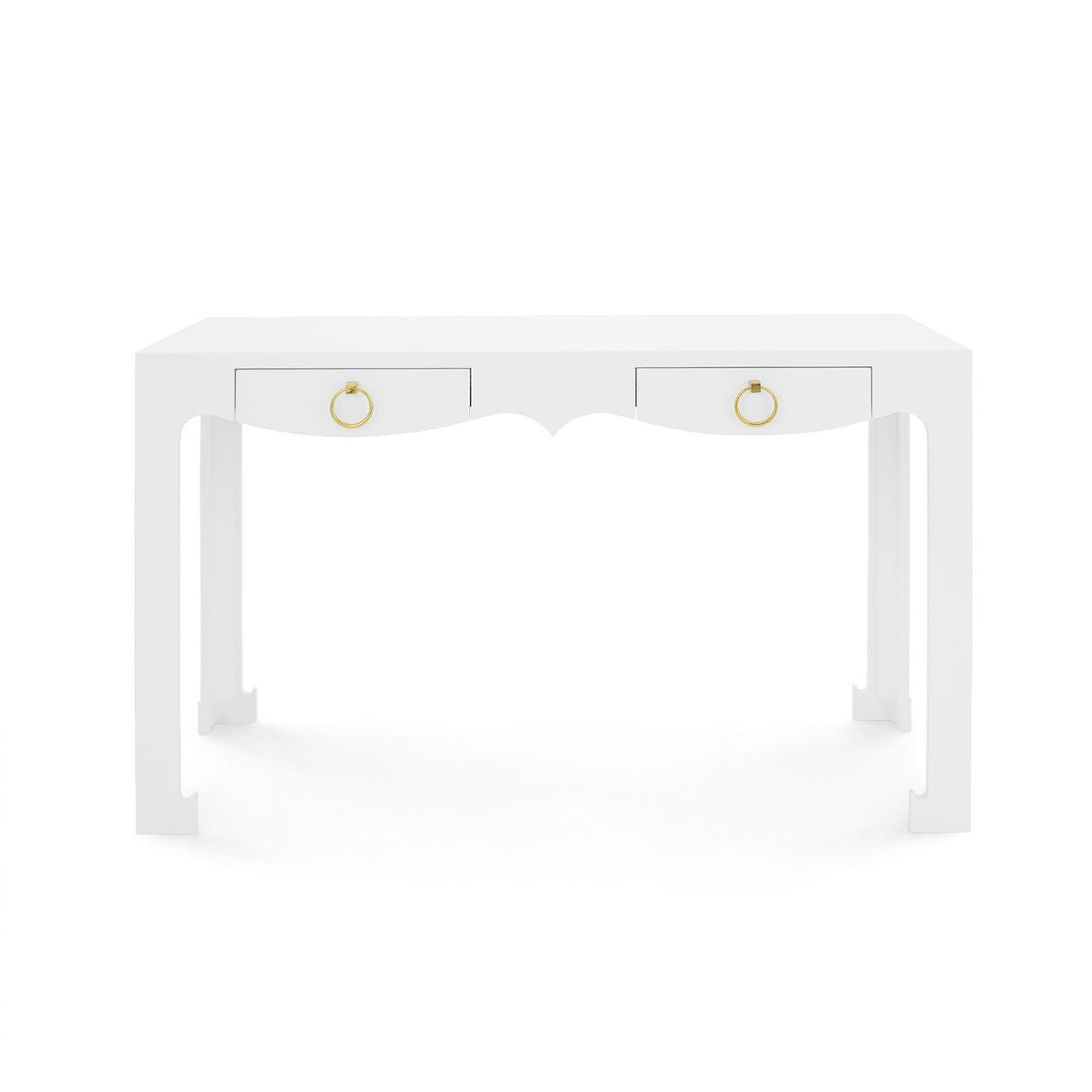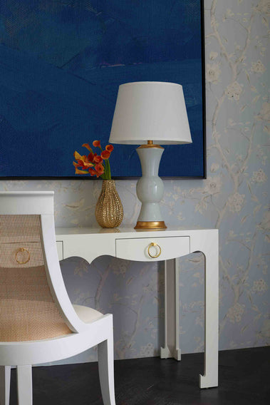 With its sleek lacquered finish and golden accents, the Jordan instantly upgrades a space in the glamorous style of Hollywood Regency decor. There's a romantic touch of the old world in its Chow feet and decorative wood-cut detailing, which gives its pair of drawers elegant, slightly curved edges. The versatile piece can be employed as a compact desk or console table, or even dressed up as a bedroom vanity topped with a mounted mirror. Pull up a seat with panache or use it as a fancy display for vases, lamps, or objets d'art. 47.5W x 22.5D x 29H