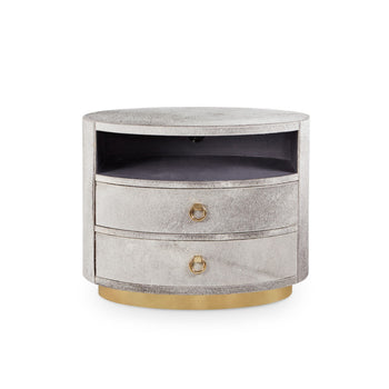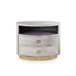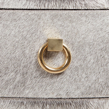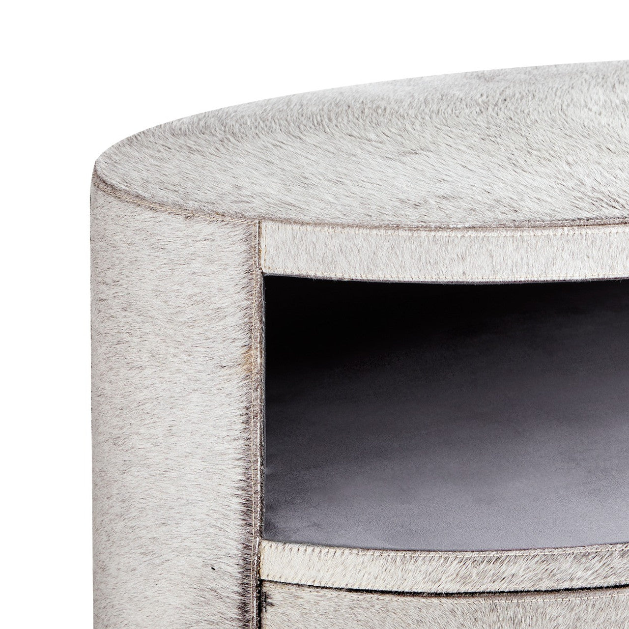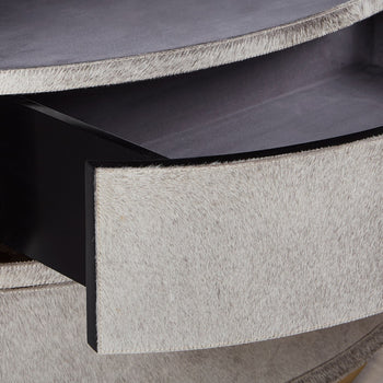 For those who don't shy away from a little decadence, meet our Julius 2-Drawer Side Table. Radiating retro glamour from its rounded silhouette to its luxurious mixed materials, the piece rises to fit cosmopolitan tastes and swanky decor schemes. The star of its construction is of course its lush coat of hair-on-hide, one of Villa & House's most beloved signature finishes. The table's unique tactility continues throughout the interiors of its two drawers and inset shelf, all covered in super-soft micro-suede. For added glitz, the Julius is adorned with polished brass accents, including its jewelry-like pulls and gilded recessed base. Whether flanking a grand sofa or bed frame, or situated solo as a statement piece, the Julius makes any room feel instantly upscale. 36W x 22D x 28.25H