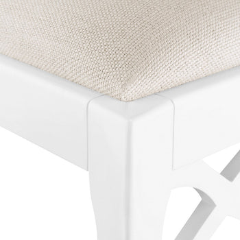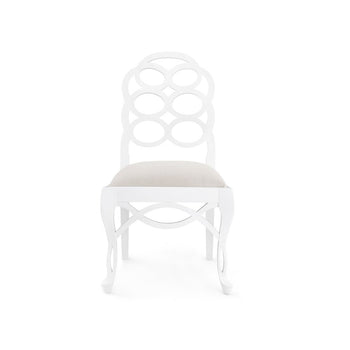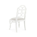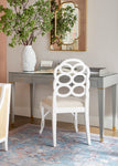 Good taste never goes out of style. Case in point: the Loop Side Chair, an elegant seat based on the iconic design of Frances Adler Elkins, one of the most prominent female furniture designers of the 20th century. Elkins introduced the Loop Chair in the 1930s, and only created eight in total. But the beloved silhouette, replete with graceful wood-cut details and looping fretwork, has remained a high-society staple, perfect for palatial Palm Beach dining rooms, breezy seaside cottages, and decor schemes ranging from Chinoiserie to classic Americana. Here our artisans have recreated the chair in white lacquered mahogany with a comfortable drop-in cushion. A true conversation piece around a dining table. 20.25W x 21.75D x 39.25H