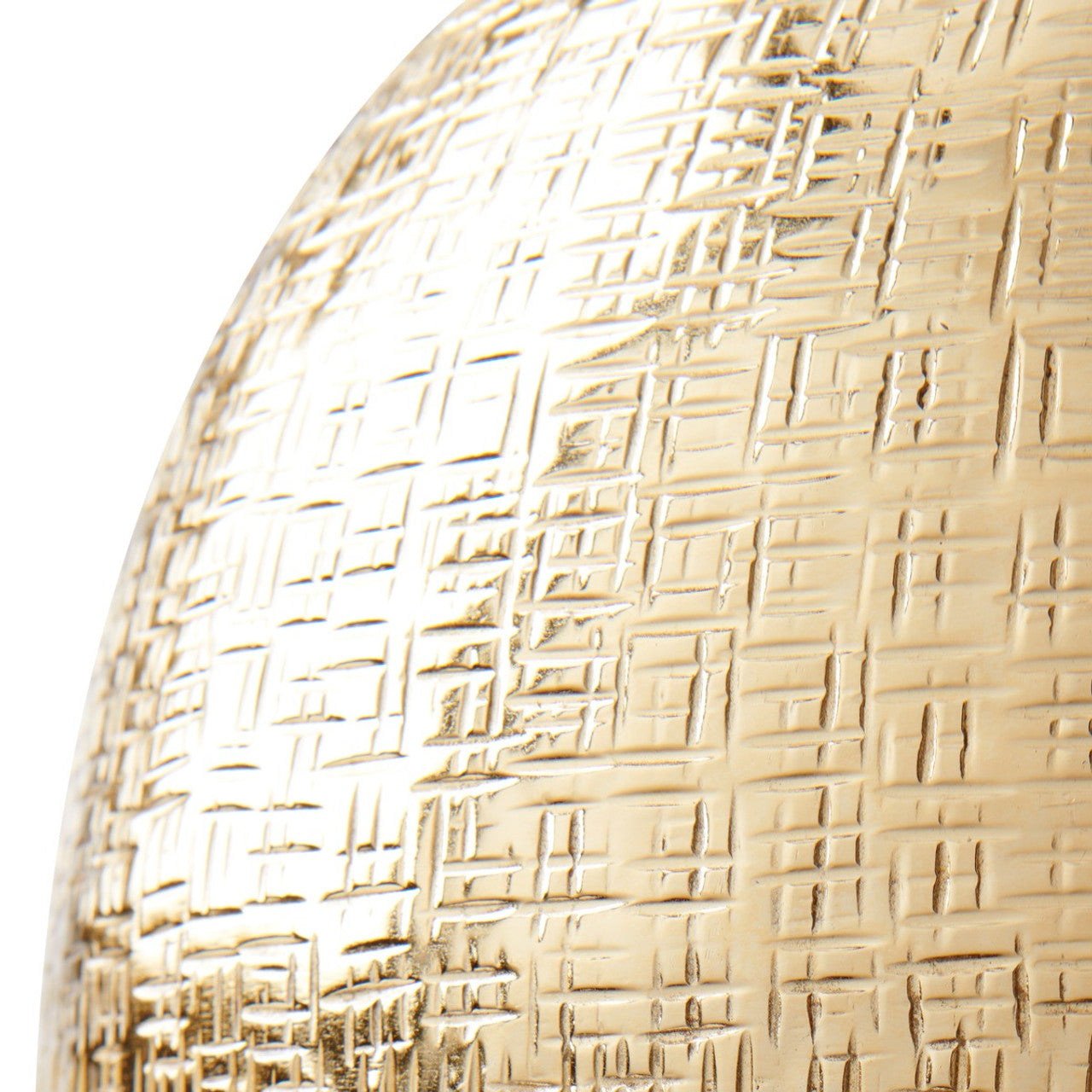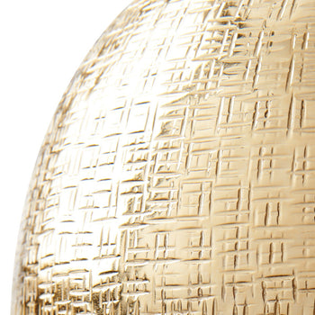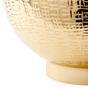 The Mali Cache Pots radiate warmth and personality, marked by a patchwork series of delicate designs. The petite patterns, which depict a cross-hatch reminiscent of tribal markings, are exquisitely embossed into the solid brass vessels. A surprising combination of texture and decorative detailing makes the Mali Cache Pot a unique and organic gourd. Spotlight one next to a sitting room sofa, or combine two (or more!) to create a romantic table centerpiece. Our designers are using the large version for newspapers! Each piece is felted on the bottom for a high-end, non-slip finish. 10W x 10D x 12H