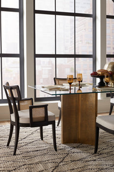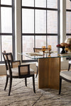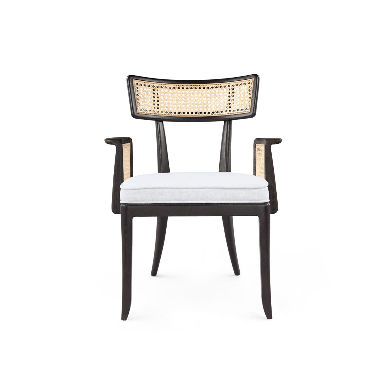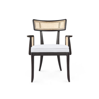 The Marshall Chair Collection is a wonderfully avant-garde addition to our seating selection. With a slight nod to the Art Deco period of the late 1930s, this piece is crafted from solid wood and octagonal cane. The back is slightly curved, and the arms are hand-carved for ergonomic comfort. The seat is fitted with a welted natural linen cushion. The Marshall Armchair is a standout addition to any dining room, office, or den. 24.5W x 21.25D x 32.5H