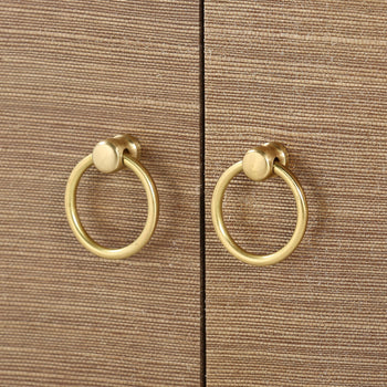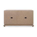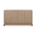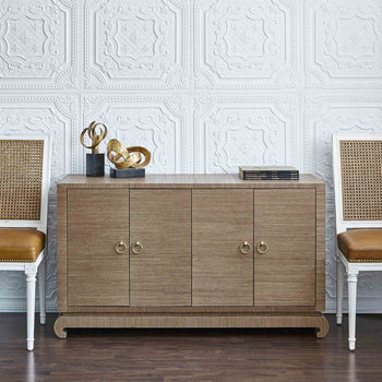 A sophisticated piece for any of your storage needs, the Meredith 4-Door Cabinet brings handsome tailoring and luxurious finishes to a study, dining room, or home entertainment area. Its classic silhouette finds a dash of decorative refinement in its base, which features delicately curved Chow-style feet and an inset edge that adds dimension to its solid form. Four doors make up its facade, adorned with glittering gold finish ring pulls. Inside, two fixed shelves, richly stained, provide generous space for glassware, linens, or toys. The Meredith is also ideal for neatly arranging electronics, with two back openings for cables and wires. This piece is finished in lush, lightly textured lacquered grasscloth - a signature design detail showcasing Villa & House's high-end craftsmanship. 52W x 17.75D x 30.25H