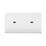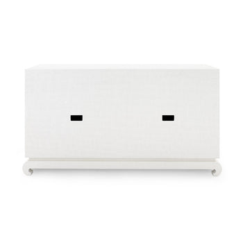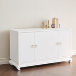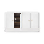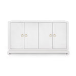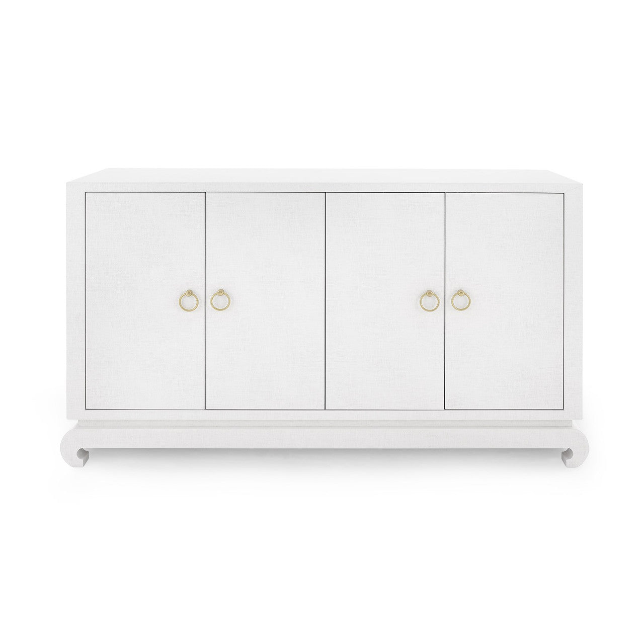 A sophisticated piece for any of your storage needs, the Meredith 4-Door Cabinet brings handsome tailoring and luxurious finishes to a study, dining room, or home entertainment area. Its classic silhouette finds a dash of decorative refinement in its base, which features delicately curved Chow-style feet and an inset edge that adds dimension to its solid form. Four doors make up its facade, adorned with glittering gold finish ring pulls. Inside, two fixed shelves, richly stained, provide generous space for glassware, linens, or toys. The Meredith is also ideal for neatly arranging electronics, with two back openings for cables and wires. This piece is finished in lush, lightly textured lacquered grasscloth - a signature design detail showcasing Villa & House's high-end craftsmanship. 52W x 17.75D x 30.25H