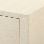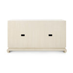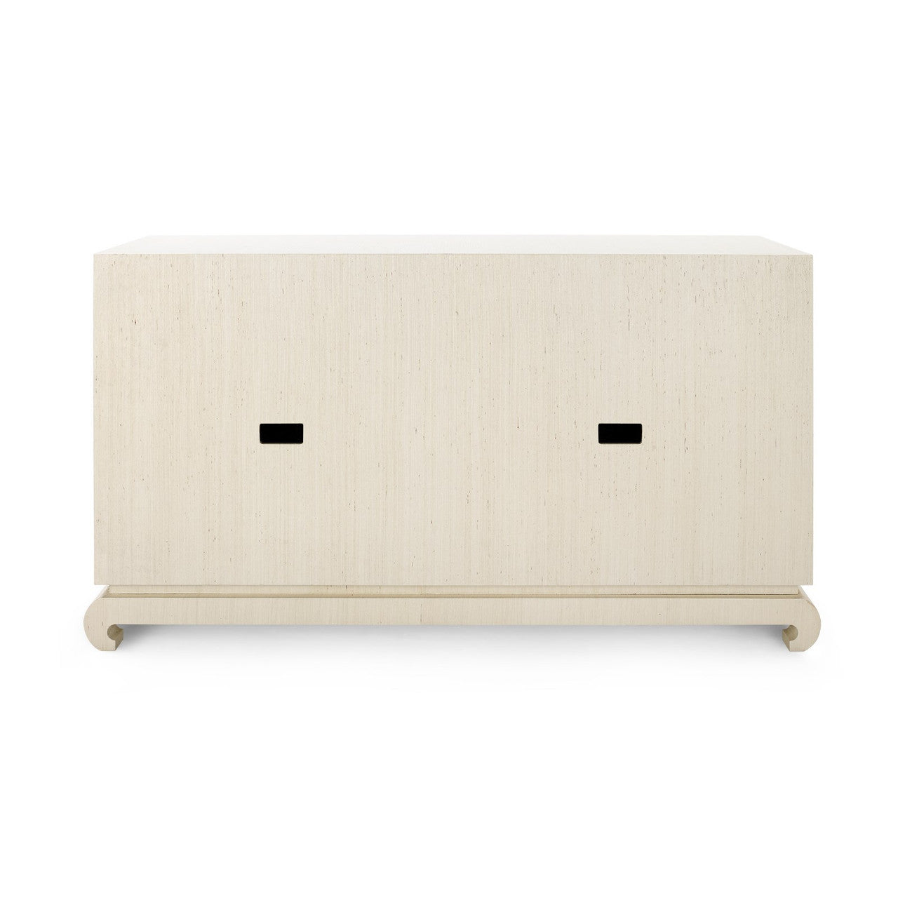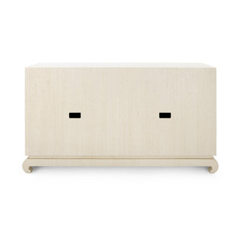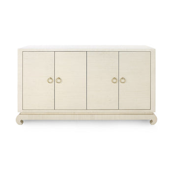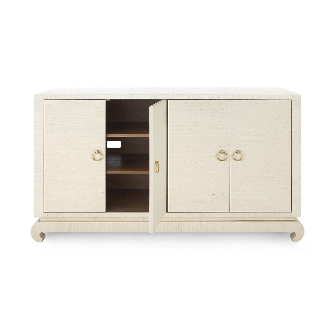 A sophisticated piece for any of your storage needs, the Meredith 4-Door Cabinet brings handsome tailoring and luxurious finishes to a study, dining room, or home entertainment area. Its classic silhouette finds a dash of decorative refinement in its base, which features delicately curved Chow-style feet and an inset edge that adds dimension to its solid form. Four doors make up its facade, adorned with glittering gold finish ring pulls. Inside, two fixed shelves, richly stained, provide generous space for glassware, linens, or toys. The Meredith is also ideal for neatly arranging electronics, with two back openings for cables and wires. This piece is finished in lush, lightly textured lacquered grasscloth - a signature design detail showcasing Villa & House's high-end craftsmanship. 52W x 17.75D x 30.25H