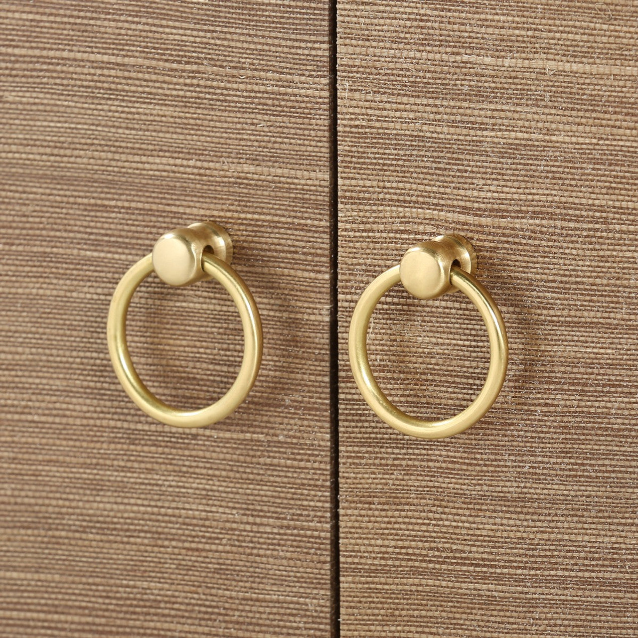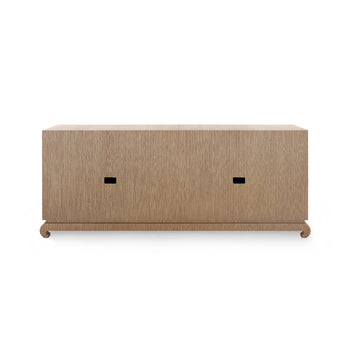 A sophisticated piece for any of your storage needs, the Meredith Extra Large 4-Door Cabinet brings handsome tailoring and luxurious finishes to a study, dining room, or home entertainment area. Its classic silhouette finds a dash of decorative refinement in its base, which features delicately curved Chow-style feet and an inset edge that adds dimension to its solid, elongated form. Four doors make up its facade, adorned with glittering gold finish ring pulls. Inside, four fixed shelves, richly stained, provide generous space for glassware, linens, or toys. The Meredith is also ideal for neatly arranging electronics, with two back openings for cables and wires. This piece is finished in lush, lightly textured lacquered grasscloth - a signature design detail showcasing Villa & House's high-end craftsmanship. 72W x 17.75D x 30.25H