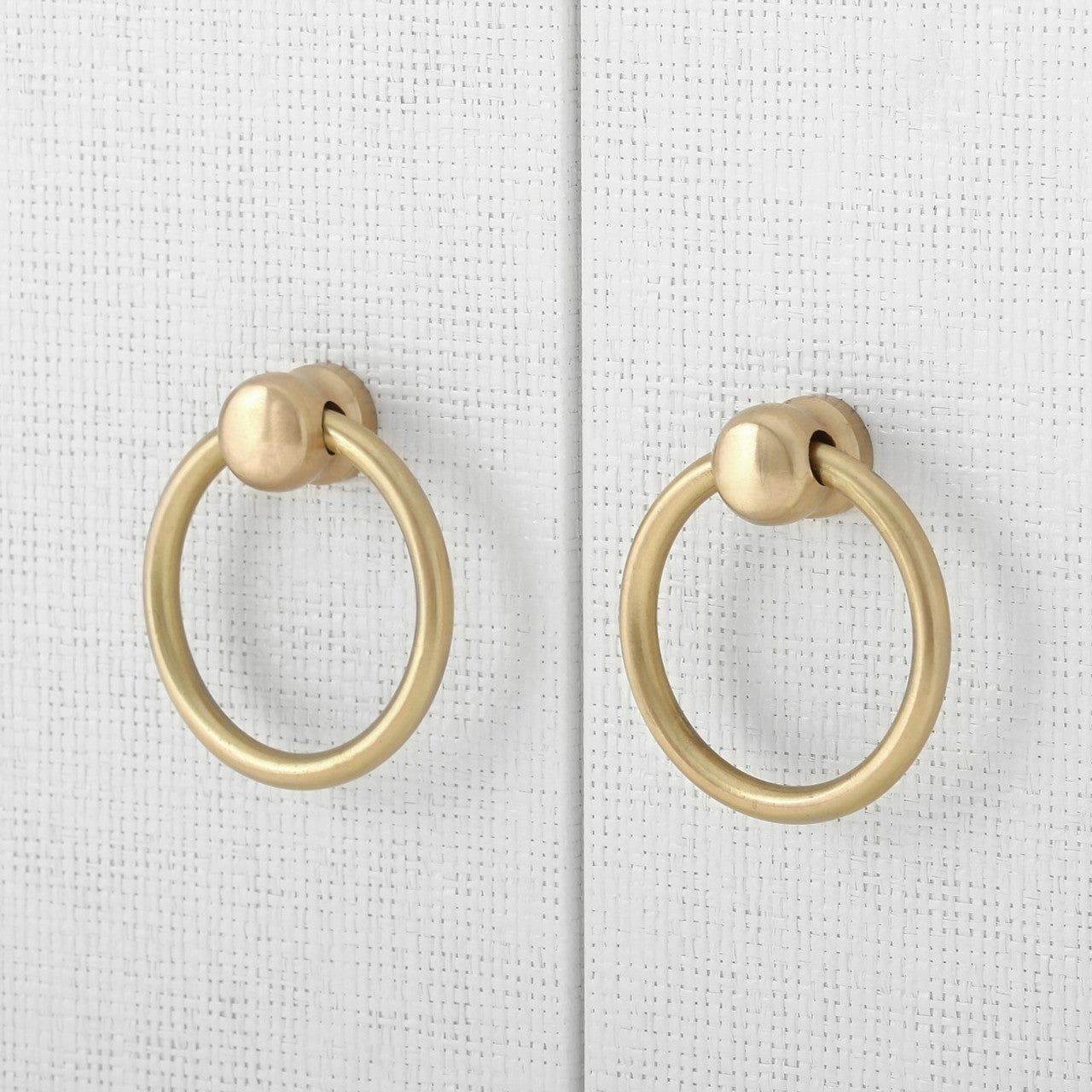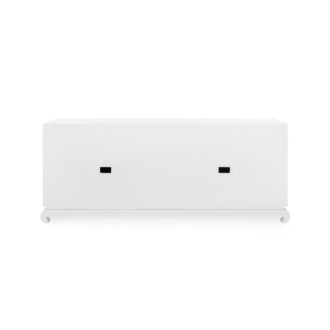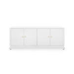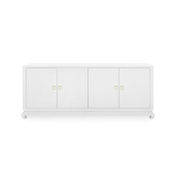 A sophisticated piece for any of your storage needs, the Meredith Extra Large 4-Door Cabinet brings handsome tailoring and luxurious finishes to a study, dining room, or home entertainment area. Its classic silhouette finds a dash of decorative refinement in its base, which features delicately curved Chow-style feet and an inset edge that adds dimension to its solid, elongated form. Four doors make up its facade, adorned with glittering gold finish ring pulls. Inside, four fixed shelves, richly stained, provide generous space for glassware, linens, or toys. The Meredith is also ideal for neatly arranging electronics, with two back openings for cables and wires. This piece is finished in lush, lightly textured lacquered grasscloth - a signature design detail showcasing Villa & House's high-end craftsmanship. 72W x 17.75D x 30.25H