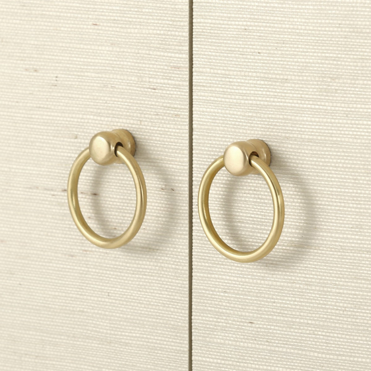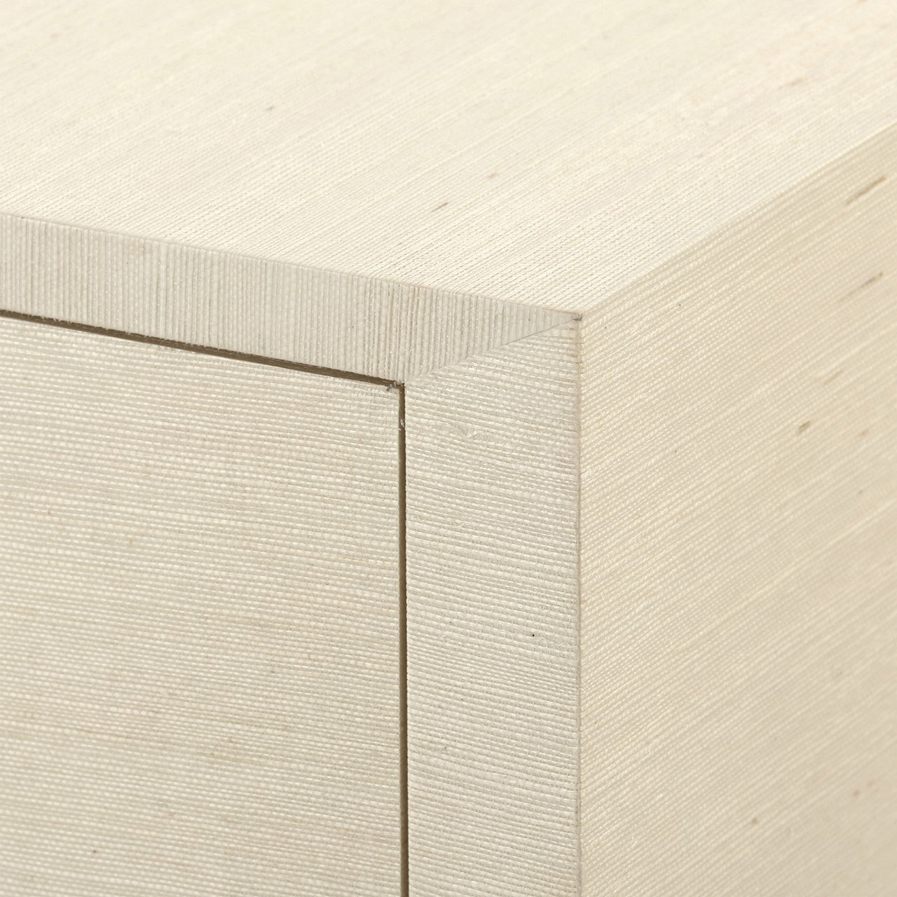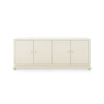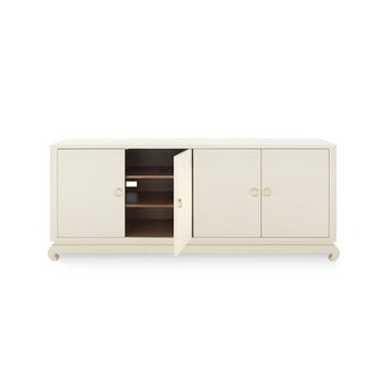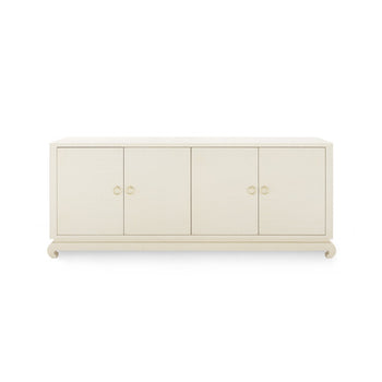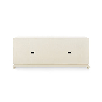 A sophisticated piece for any of your storage needs, the Meredith Extra Large 4-Door Cabinet brings handsome tailoring and luxurious finishes to a study, dining room, or home entertainment area. Its classic silhouette finds a dash of decorative refinement in its base, which features delicately curved Chow-style feet and an inset edge that adds dimension to its solid, elongated form. Four doors make up its facade, adorned with glittering gold finish ring pulls. Inside, four fixed shelves, richly stained, provide generous space for glassware, linens, or toys. The Meredith is also ideal for neatly arranging electronics, with two back openings for cables and wires. This piece is finished in lush, lightly textured lacquered grasscloth - a signature design detail showcasing Villa & House's high-end craftsmanship. 72W x 17.75D x 30.25H
