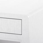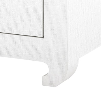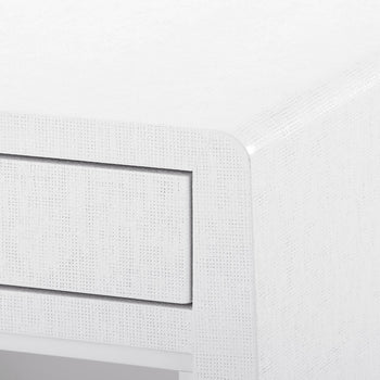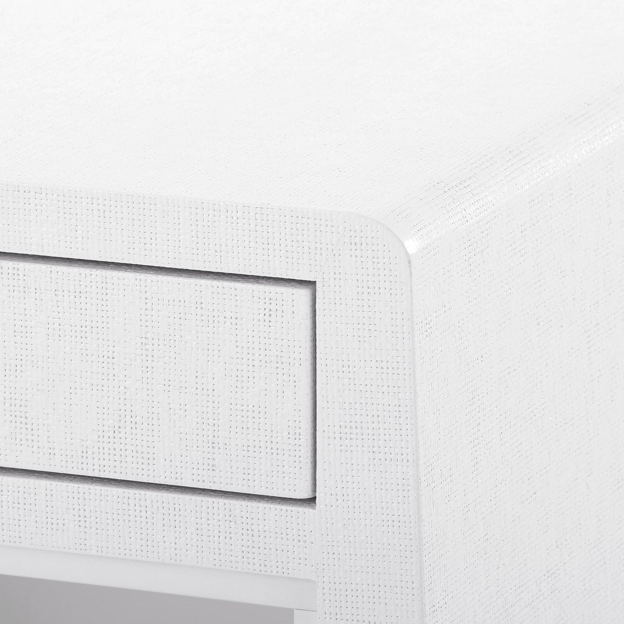 The stately pieces of our Ming Collection radiate worldly sophistication and contemporary class. Handsomely tailored in both form and finishings, the Ming 2-Drawer Side Table in clean white boasts a subtly graduated silhouette, soft corners, and thoughtfully-applied details, such as an open, inset shelf that allows for decorative display, and delicately curved Chow-style feet. Two drawers adorned with polished brass ring pulls supply convenient hide-away storage, each with rich stained wood interiors. Draped in lush, textured grasscloth with a lacquered finish, the Ming elevates its surroundings with its refined presence. It's perfect for pairing on either side of a bed or sofa, where it will get plenty of use. 25W x 18D x 29.5H