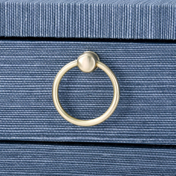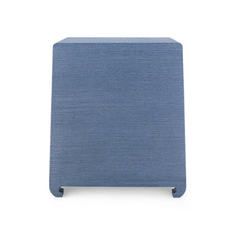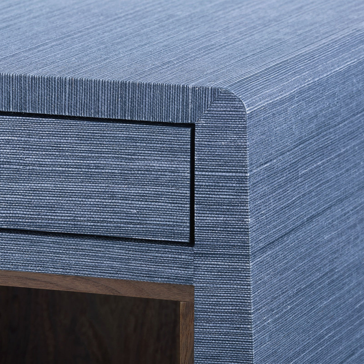 The stately pieces of our Ming Collection radiate worldly sophistication and contemporary class. Handsomely tailored in both form and finishings, the Ming 2-Drawer Side Table in warm navy blue boasts a subtly graduated silhouette, soft corners, and thoughtfully-applied details, such as an open, inset shelf that allows for decorative display, and delicately curved Chow-style feet. Two drawers adorned with polished brass ring pulls supply convenient hide-away storage, each with rich stained wood interiors. Draped in lush, textured grasscloth with a lacquered finish, the Ming elevates its surroundings with its refined presence. Perfect for pairing on either side of a bed or sofa, where it will get plenty of use. 25W x 18D x 29.5H
