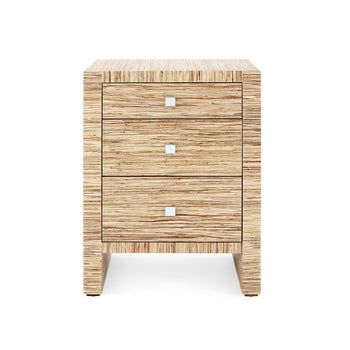 Structured and streamlined, the silhouette of the Morgan 3-Drawer Side Table speaks to modernist tastes. Stout proportions give it an air of boldness, while a raised, open base keeps the piece feeling light and airy. Its facade is formed of three stacked drawers, graduated in size, which each open on soft-closing glides to reveal rich stained interiors and generous storage for easy-to-reach essentials. The Morgan certainly embraces minimalism with its shape, but finds distinction in its luxuriously textured finish. Villa & House's designers have seamlessly applied lacquered papyrus in natural tones, resulting in a fresh, organic, and endlessly chic side table perfect for beachy homes or neutral decor schemes. As an end table or nightstand, it can be topped with picture frames, a lamp, or your favorite art piece. 19.75W x 16D x 26.5H