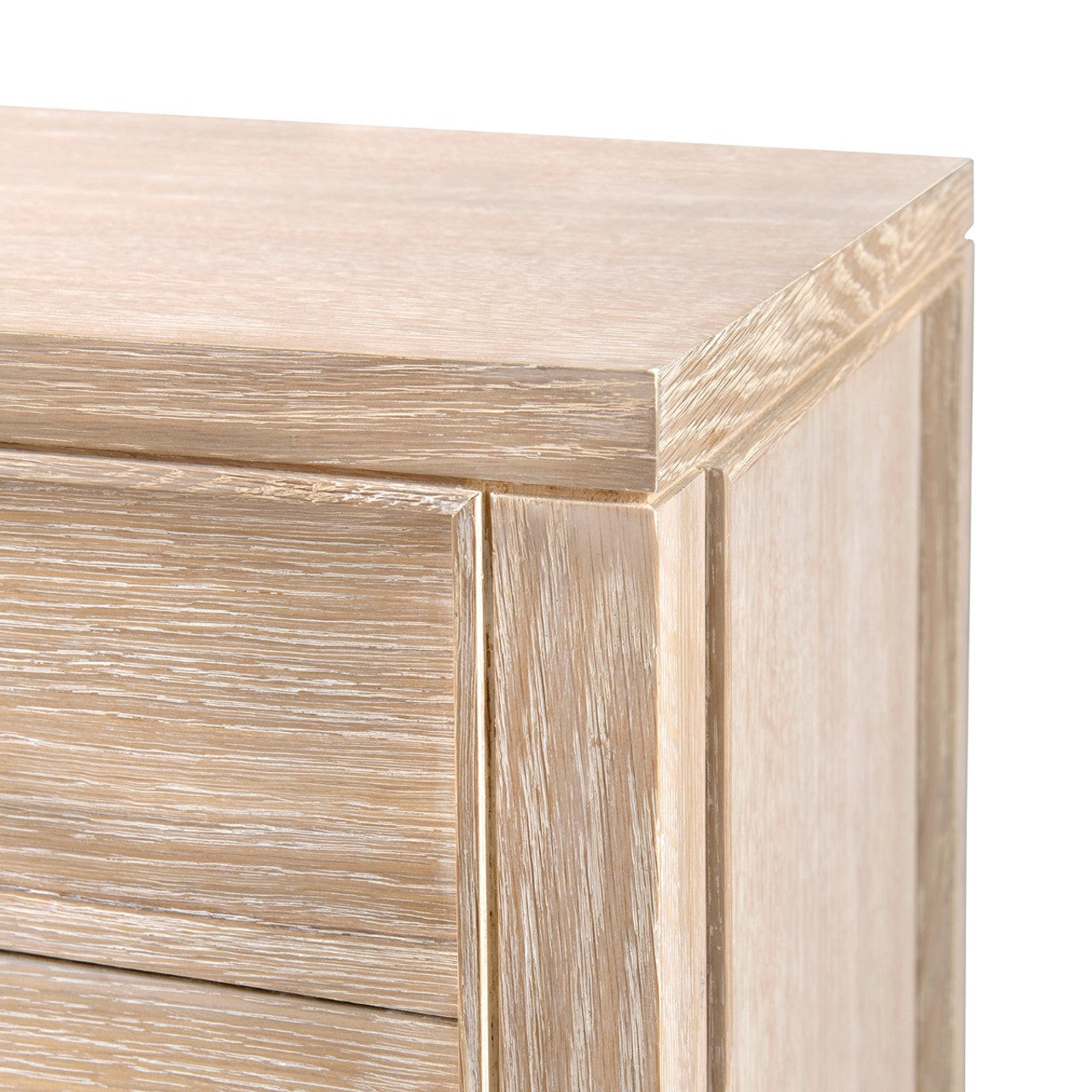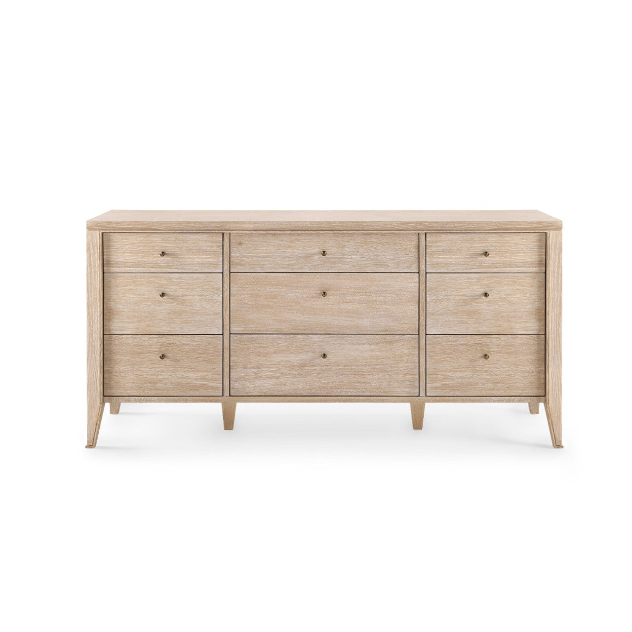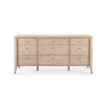 The Paola 9-Drawer Extra Large Dresser features oak veneer interior, soft closing glides, and bronze pulls. The straight, parallel lines use shadow to affect the appearance of a piece and amplify the furniture's reveals. As a light-colored wooden storage piece, there is a hint of something almost Scandinavian, but the overall impression is chic and French with its hand-carved channeled details and subtle accents. The stylish Paola Collection feels dressy while simultaneously being open and airy. 62W x 18D x 30.5H