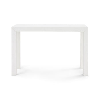 The Parsons Collection exemplifies Villa & House's commitment to bringing luxury to life through timeless silhouettes, unique materials, and unmatched craftsmanship. In the Parsons Console Table, a classic shape is reimagined through a contemporary lens, with stout lines and structured proportions giving its pared-down profile a splash of modern personality. In lieu of ornamentation, the piece showcases a sumptuous grasscloth finish in clean white, sealed with lacquer for subtle shine and layered tactility. The Parsons' sophisticated simplicity and uniform color make it the perfect canvas for personalized decor and display. Dress it up with gilded accents in a lavishly decorated space, or embrace its minimalism for modern schemes. It's just waiting for your creative touch. 48W x 16D x 30H