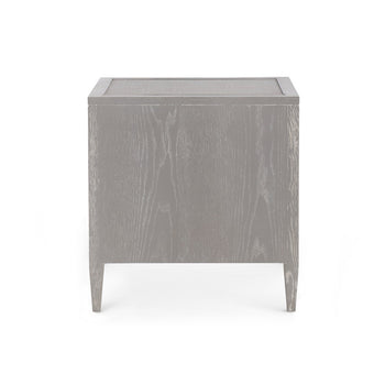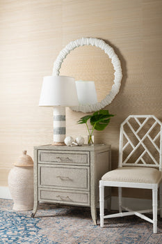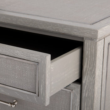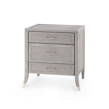 The old world sophistication and polished presence of the Paulina 3-Drawer Side Table make it truly hard to resist. Its silhouette embraces the expressive elegance of vintage Chinoiserie design, while its construction boasts the unmatched quality of Villa & House's contemporary craftsmanship. A marriage of organic materials, the Paulina brings a framework of gray washed oak veneer together with carefully woven and lacquered jute panels, which adorn the top, sides, and trio of drawers. Gorgeous details bring the piece together, and act as a true testament to the skills of our artisans, from the gracefully flared front legs to the glittering accents of nickel appearing on its drawers and sabots. For cultured tastes and cosmopolitan spaces, this side table is a must. 26W x 18D x 26.25H