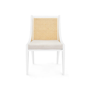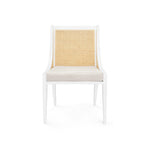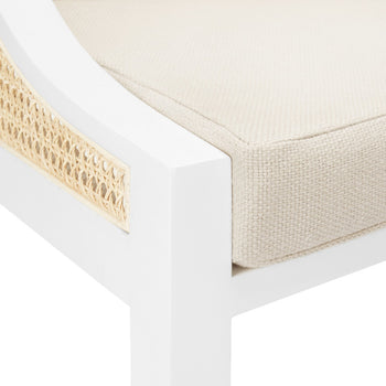 With classic profiles and light, natural materials, our Raleigh Collection embraces old school charm—with a few upscale updates, of course. The Raleigh Armchair is both relaxed and refined, featuring a mahogany frame with a modern white lacquered finish. Our masterful craftsmen have fashioned a gracefully sloping silhouette which not only ensures the feeling of comfort, but the look of ultimate elegance. Artisanally hand-tied and bleached caning has been applied to its back and sides, lending the Raleigh a luxuriously organic look fit for a modern farmhouse or breezy beach home. Other details include gently tapered and angled legs in the mid-century style and a plush linen drop-in cushion for chic comfort and cool neutrality. 22.25W x 22.5D x 35H